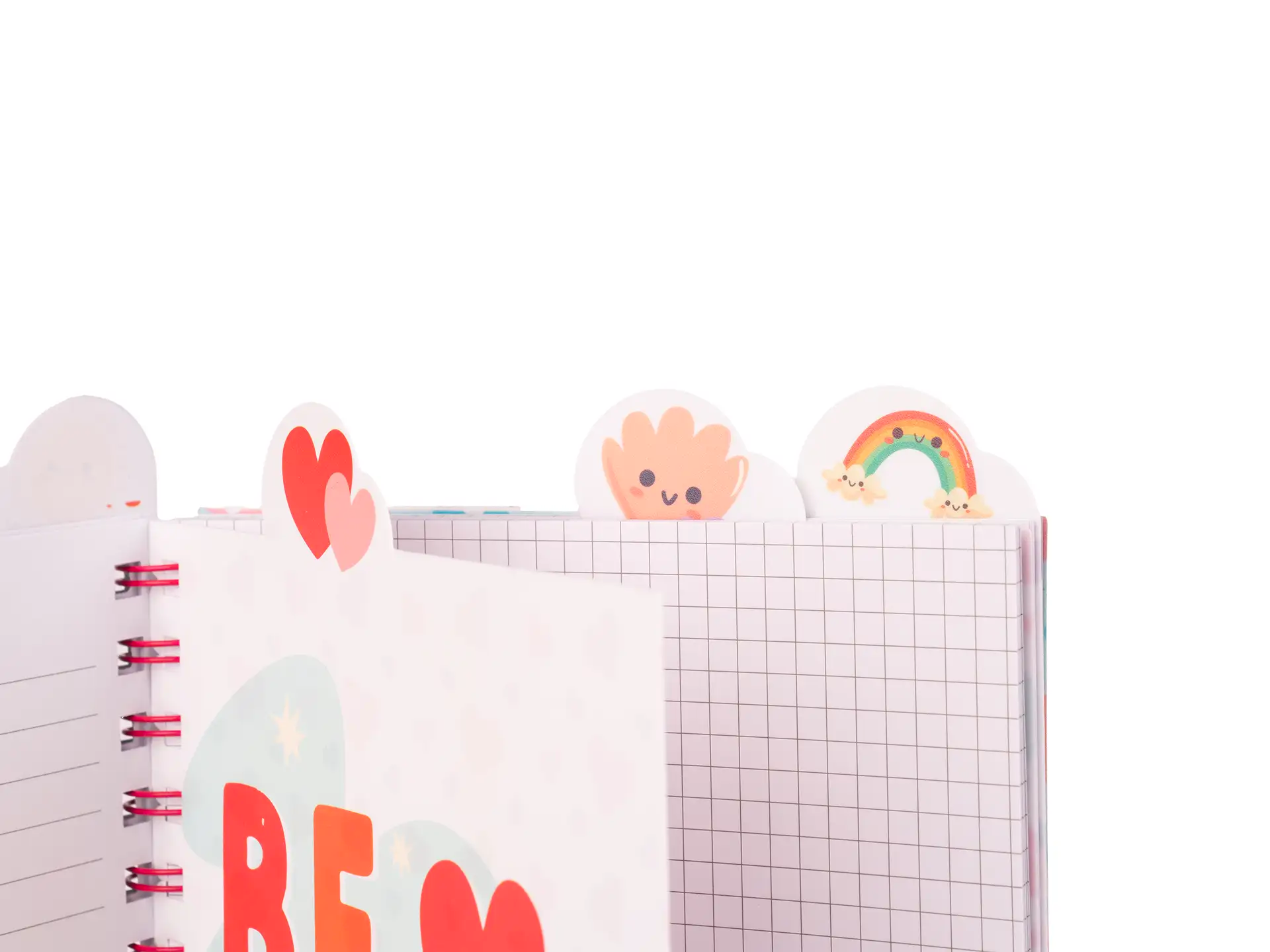 Separa i tuoi task con i notebook Good Vibes! Questi piccoli quaderni per appunti in formato A5 e A6 sono realizzati con spirale cromata e copertina rigida. La carta da 75g assicura un’ottima resa di scrittura e l’alternanza di rigature tra quadretti e righe consente di adattare l’utilizzo in base alle tue esigenze. Realizza disegni e sketch, prendi appunti e scrivi le tue idee giorno per giorno! I divisori in ppl con le iconcine colorate sono perfette per separare ogni categoria. Divisori in PPL.