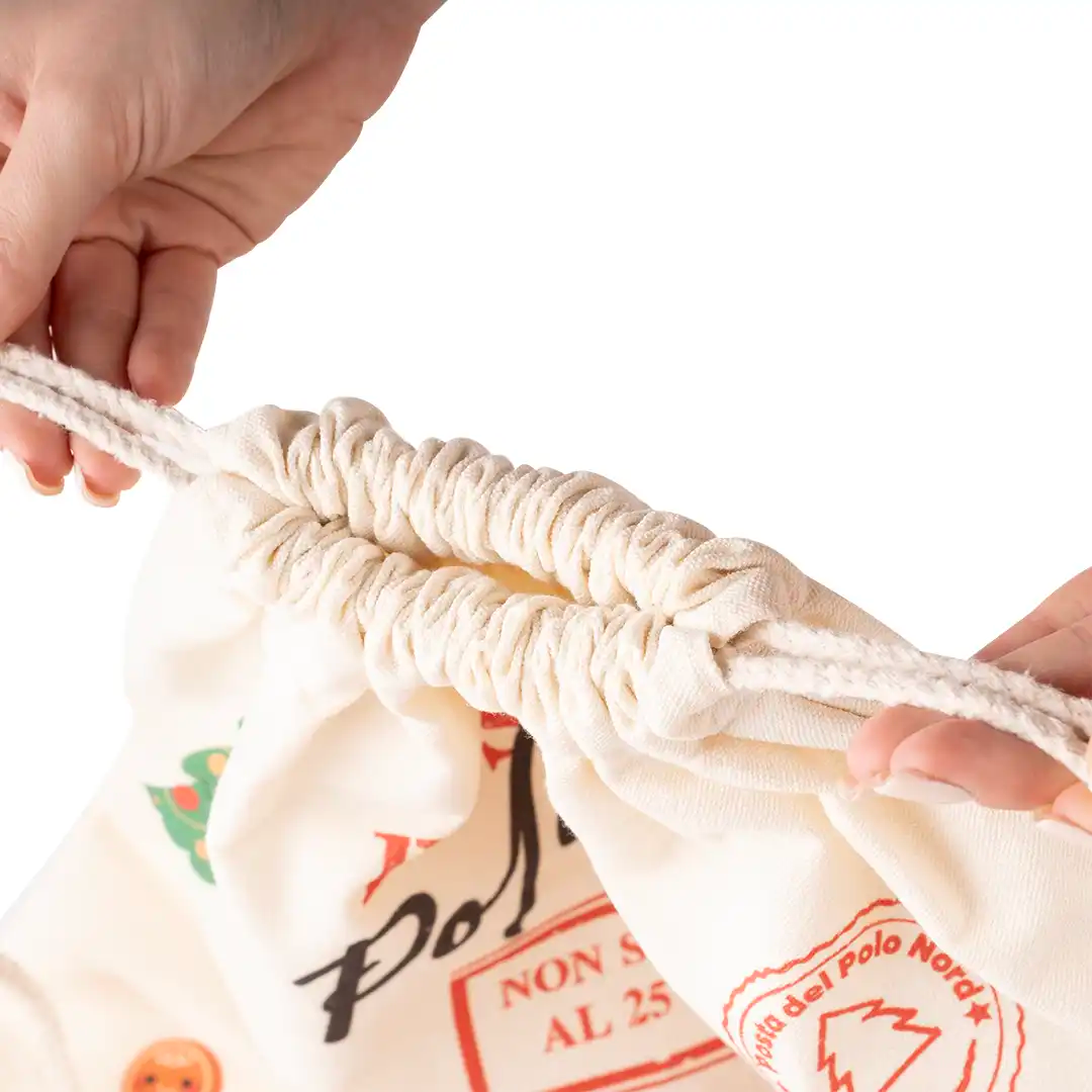 Realizzato in cotone e poliestere, con chiusura a coulisse e capienza fino a 8 kg, è l’accessorio ideale per raccogliere doni, sorprese e biglietti pieni di magia. Riutilizzabile e decorativo, porta un tocco di autenticità sotto l’albero.