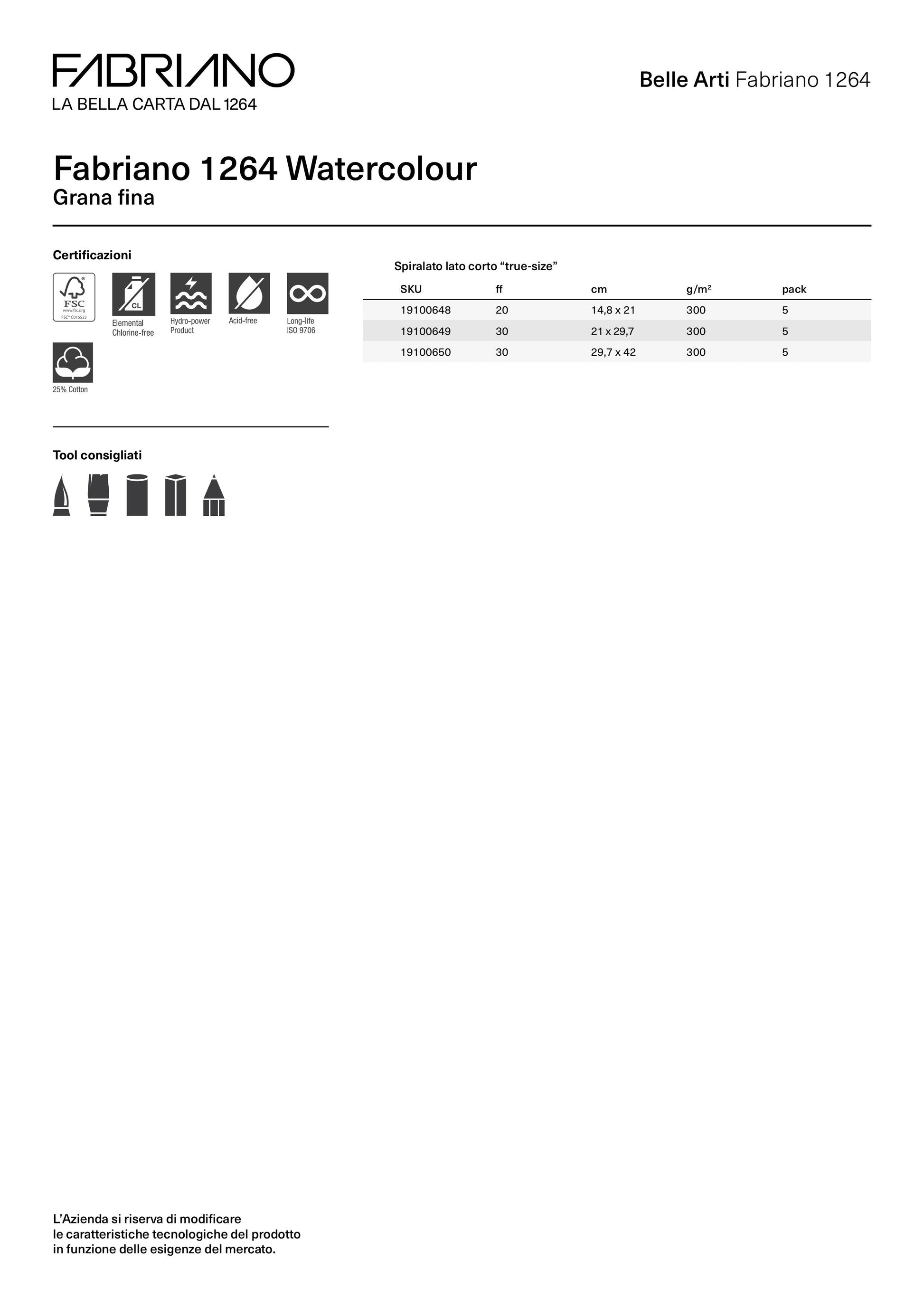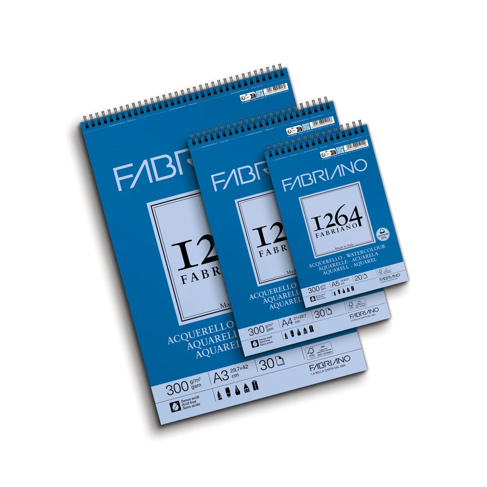 La carta per acquerello Fabriano 1264, composta per il 25% da cotone, offre una superficie a grana fina di altissima qualità. Con un peso di 300 g/m², garantisce un’assorbenza bilanciata che consente pennellate precise e colori vibranti, permettendo correzioni rapide senza danneggiare la carta. Disponibile in blocchi collati su un solo lato nei formati 14,8x21 cm, 21x29,7 cm e 29,7x42 cm, è la scelta ideale per artisti di ogni livello, dai principianti ai professionisti.
