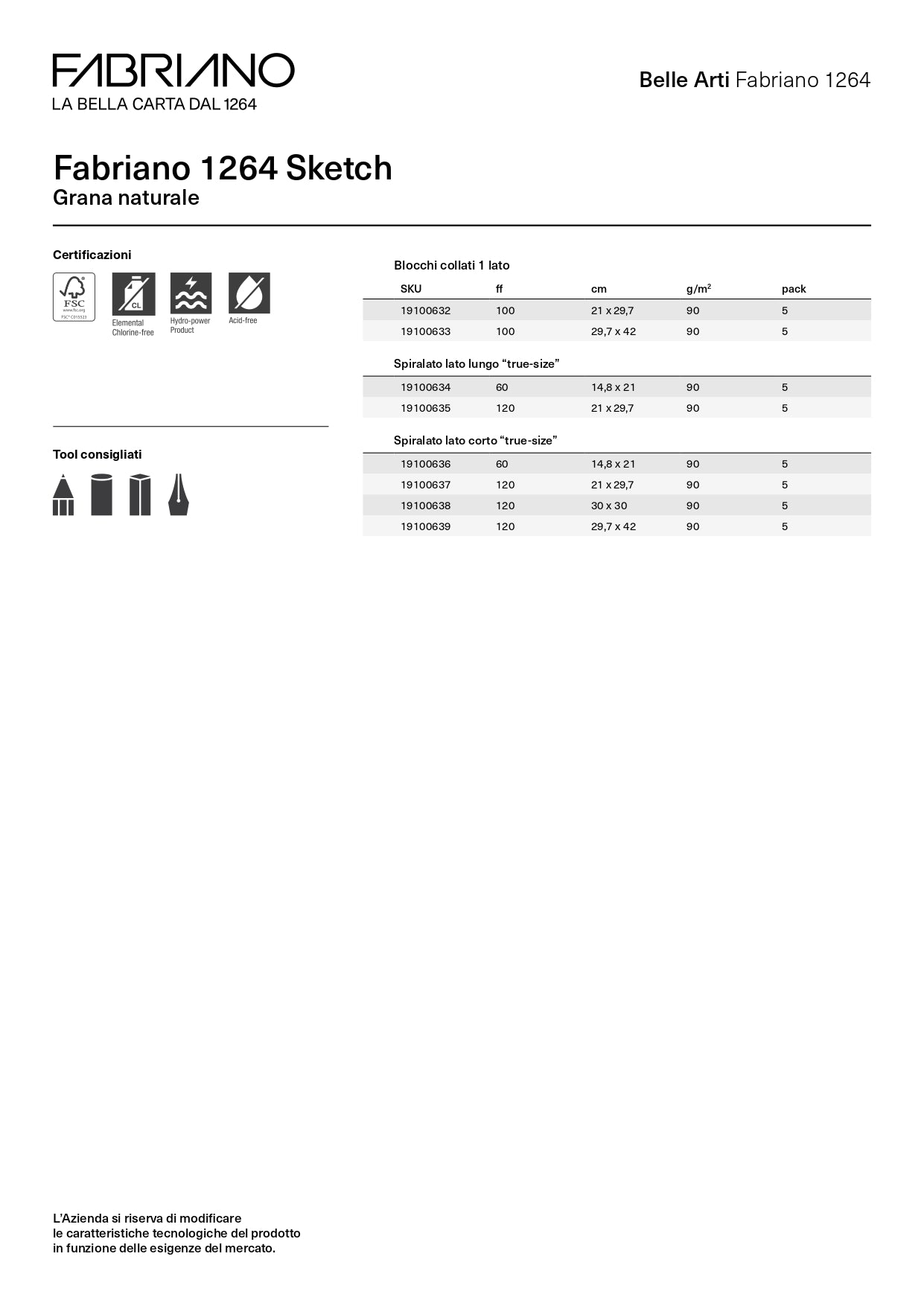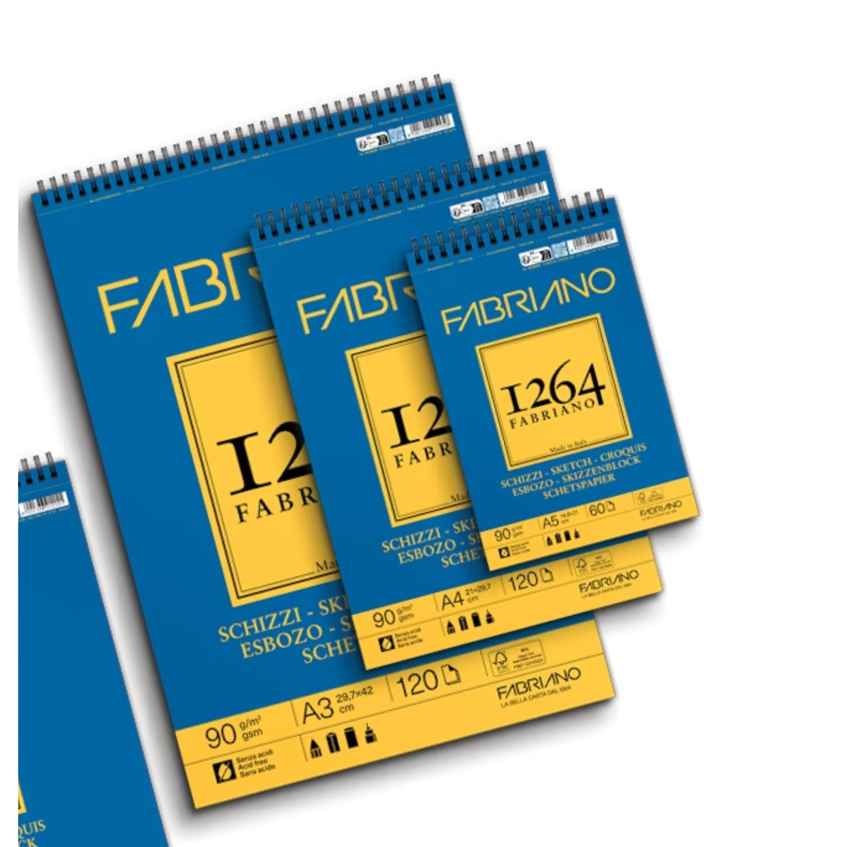 La carta Fabriano 1264 Schizzi è progettata per tutte le tecniche di disegno, con particolare attenzione ad acquerello e tempera. Con un peso di 90 g/m², offre una superficie leggermente avoriata e una tenue grana che valorizza ogni dettaglio creativo. Disponibile in formati spiralati “true-size” 14,8x21 cm, 21x29,7 cm e 29,7x42 cm, garantisce praticità e qualità superiore per schizzi professionali e lavori di precisione.