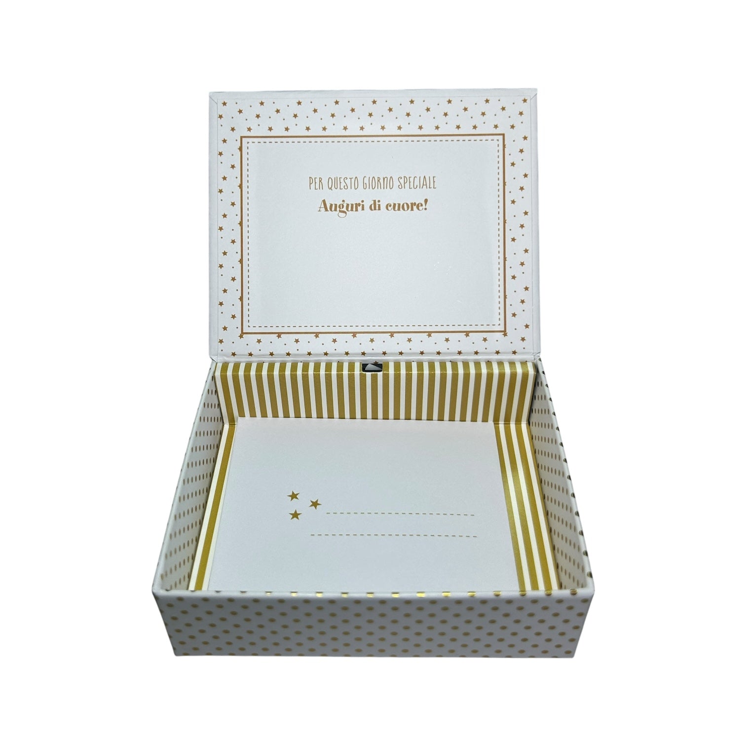 La Scatolina Augurale Sonora è versatile e perfetta per ogni occasione! È un biglietto d'auguri, un porta soldi o una scatola regalo, con una sorpresa in più: si apre e suona, rendendo l'augurio ancora più speciale! Personalizza il messaggio con il biglietto incluso, oltre alla frase già scritta all'interno. Festeggia con stile e originalità con scatolina!